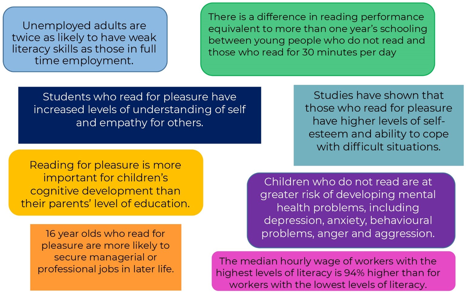 Research consistently shows that engagement with reading is one of the strongest predictors of future success. Reading develops cognitive function and shapes individuals who are articulate, informed, empathetic, and confident—qualities essential for both achievement and wellbeing.
